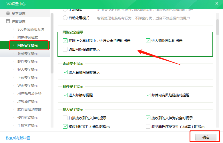 这样再进入网购网站时,360安全卫士的弹窗提醒就不会再出现了,如果小伙伴们想要开启弹窗的话直接进入网购安全提示确定勾选就可以了。希望这篇文章可以帮助大家。