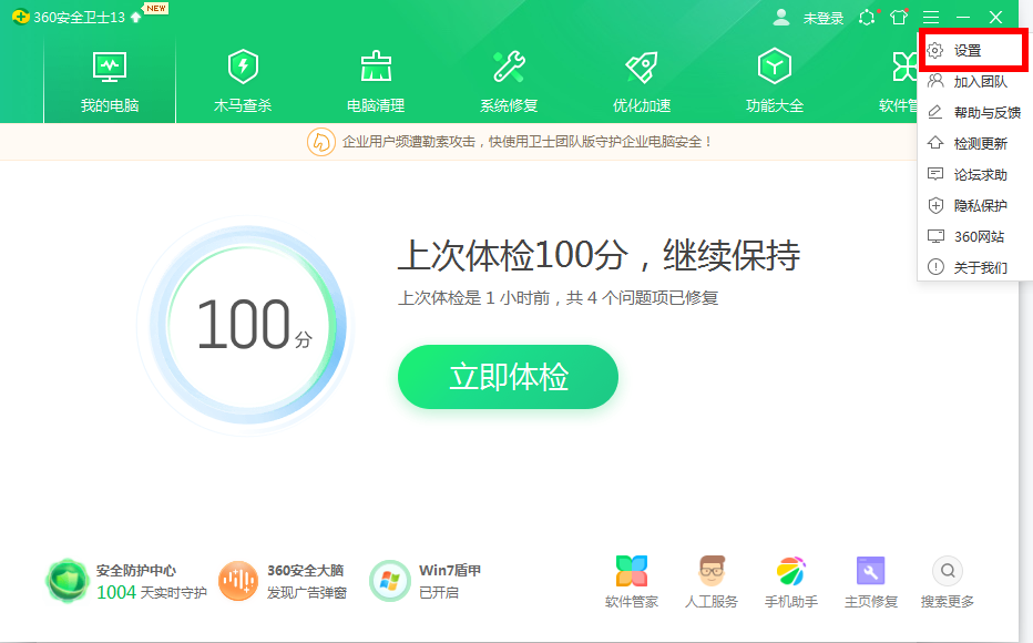 第三步,选择下拉窗口中的设置选项,由此进入360设置中心;