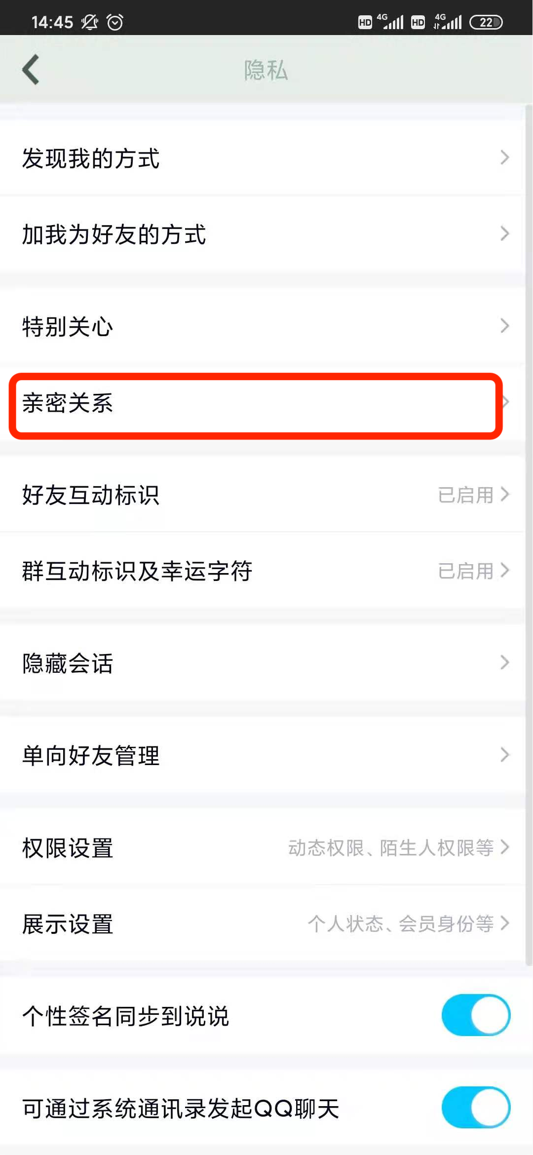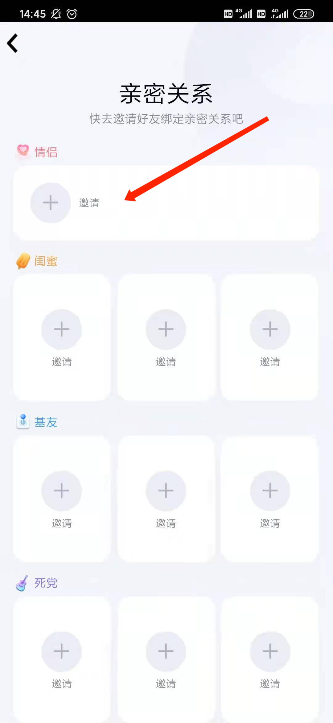 第四步, 打开【亲密关系】,找到相对应的关系发送邀请给好友,等待好友通过即可。