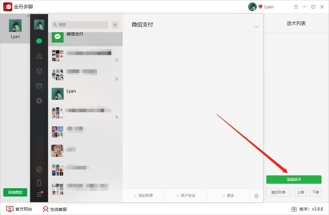 金舟多聊是一款为大家量身打造的专业聊天交友工具,实现实时聊天的同时,还支持同时登录多个微信账号,登录的每个账号都可以接收和发送消息,并能保证聊天信息的安全。在金舟多聊软件中,有一个【话术列表】功能,可以把常用语句或者特定语句添加进来,直接点击发送即可,就像是添加的表情包一样。特别是给客服、销售、微信运营等从业人员带来了极大的方便,对于维护客户和跟客户及时沟通有很大的帮助。