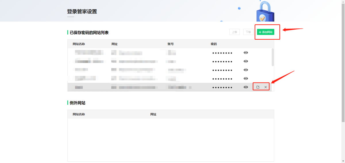 第三步,点击下方的设置图标,进入登录管家设置页面,我们可以在该页面手动添加网站、修改网站网址信息或是删除已保存的网站信息。