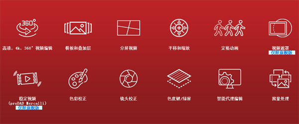 无缝转场和变形过渡,2000+特效、转场、标题及样本,导出MOV透明格式,LUT一键调色,多机位编辑。