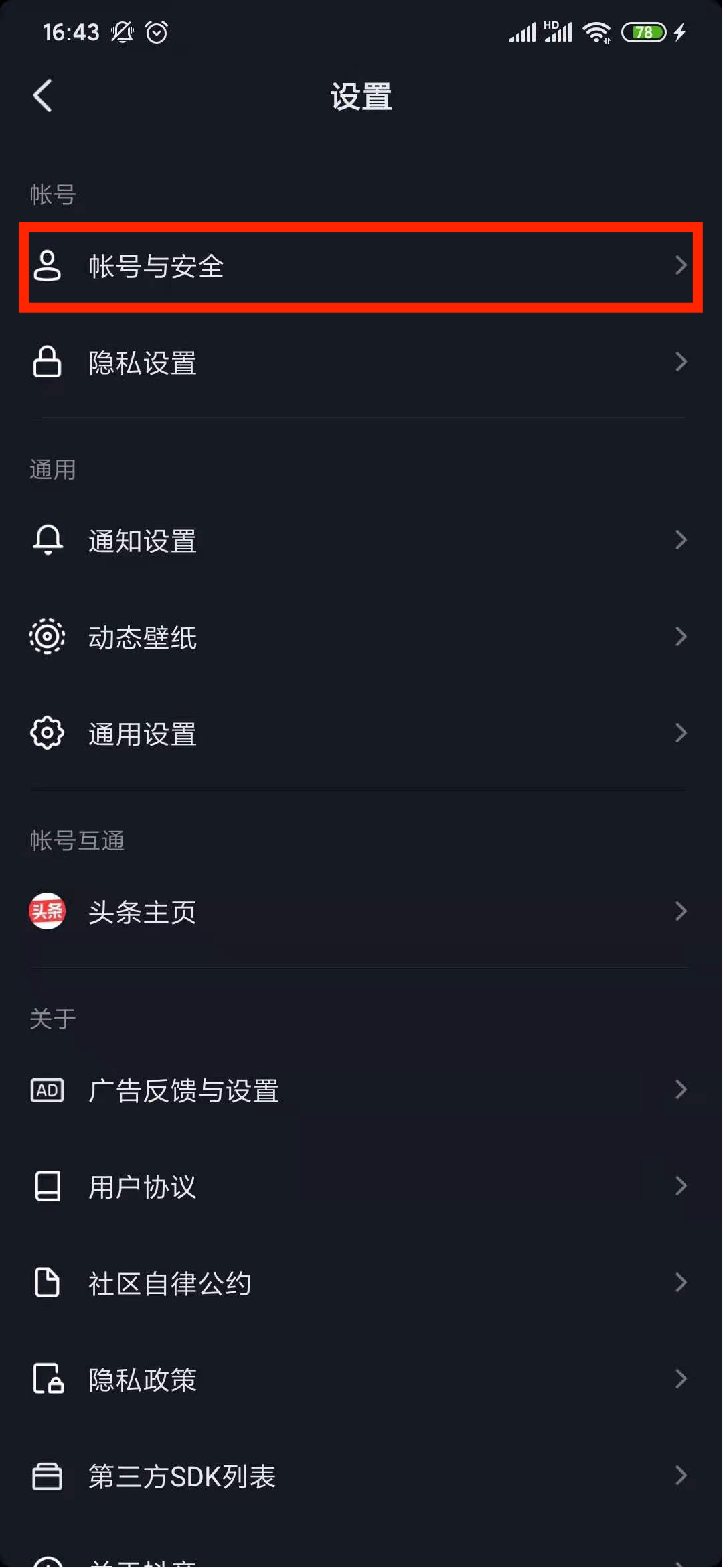 第三步,点击这个菜单列表中的“设置”,选择其内的“账号与安全”即可。