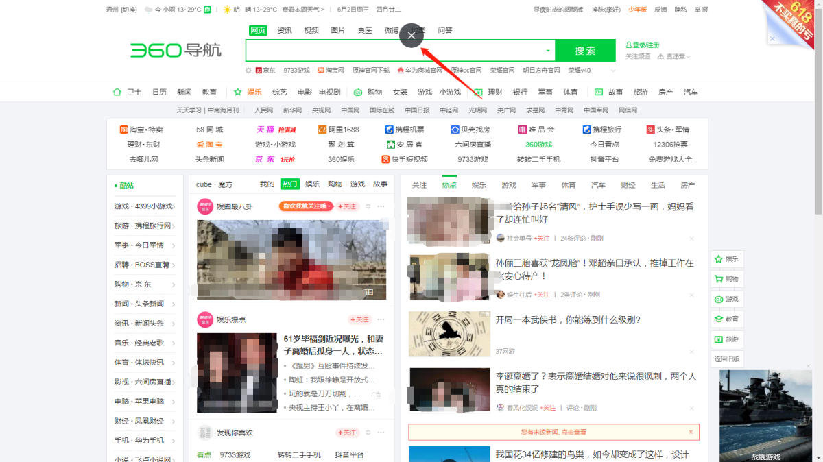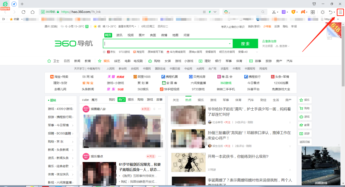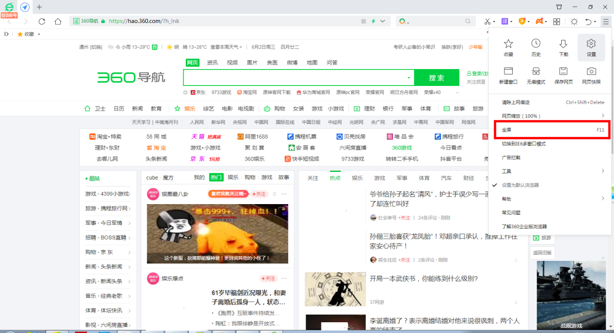 我们在打开360安全浏览器后点击右上角“打开菜单”,在菜单中便有“全屏”选项。点击全屏后浏览器便进入全屏模式,若是想关闭除快捷键之外还可用鼠标轻触上方,一个“×”关闭标识便会弹出,点击即可退出全屏浏览。