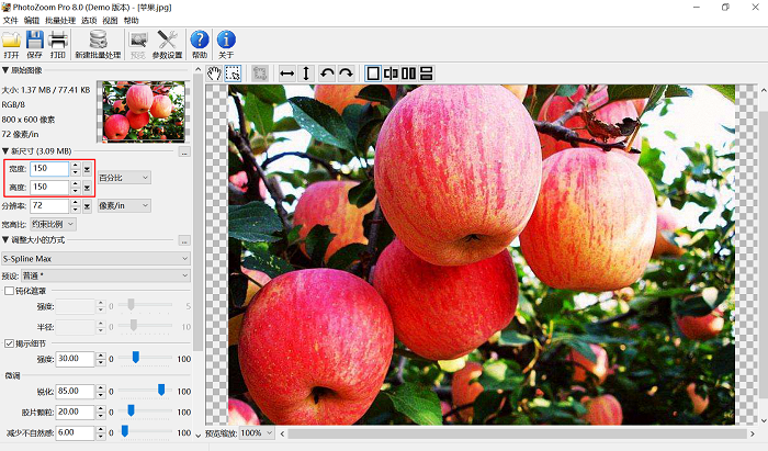 在页面左侧工具栏内分别找到【宽度】和【高度】选项卡,直接在后面框中输入需要放大的尺寸,既然要放大那就需要填写的数字比原来的大才行,如下图这样小编填写的是150放大效果还不错哟,完全没有失真,大苹果看的一样的清晰。