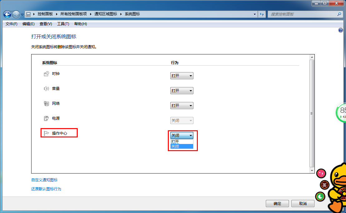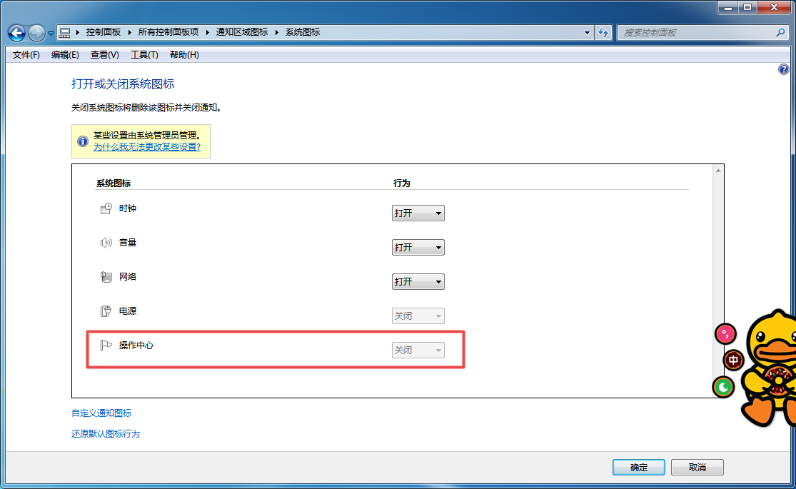 第六步,最后我们回到系统图标的设置窗口,我们就可以看到,此时的【操作中心】选项的按钮就不是灰色的了,是可选的状态了,此时我们就可以将操作中心的系统图标打开了。