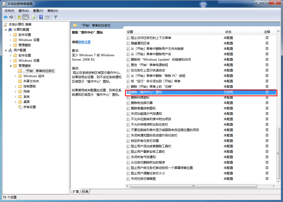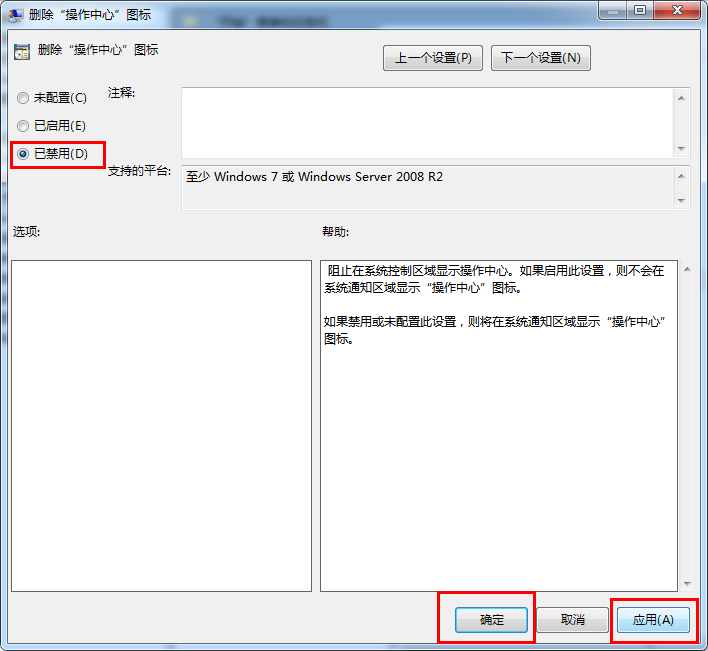 第五步,然后电脑就会弹出【删除”操作中心”图标】的设置窗口了,我们在此窗口当中,将其设置为【已禁用】或者是【未配置】选项,然后点击窗口右下角的【应用】按钮,再点击【确定】按钮。