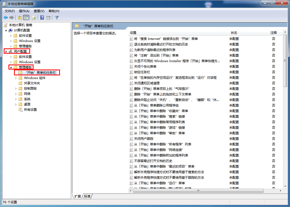 第三步,接着电脑上就会弹出【本地组策略编辑器】的窗口了,我们在此界面的左侧,找到【用户配置】下的【管理模板】选项,接着在【管理模板】选项下,找到【开始菜单和任务栏】选项。