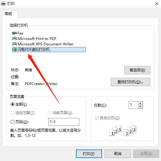 第三步,此时就会弹出【打印】窗口了,在此窗口当中,选择【闪电PDF虚拟打印机】选项,然后再点击【打印】按钮。