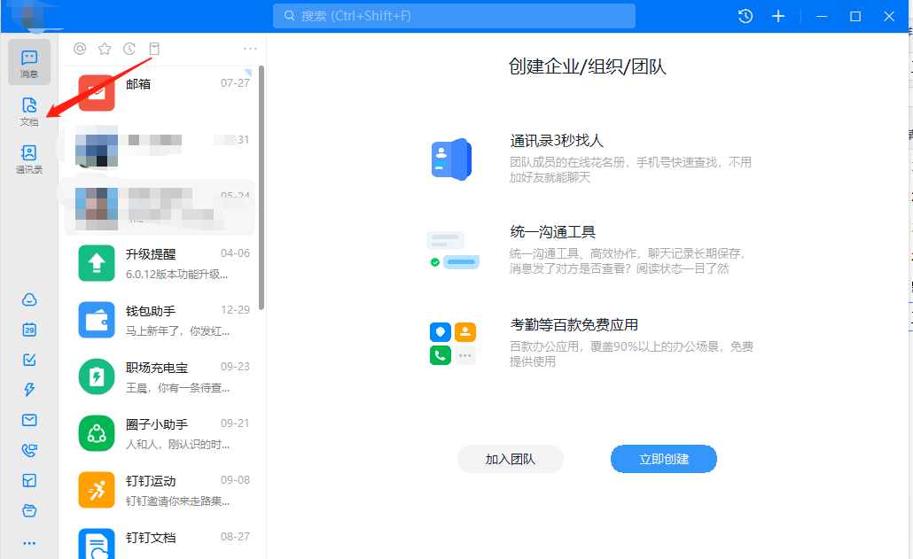 第一步: 打开钉钉,点击左侧编栏中的文档图标。