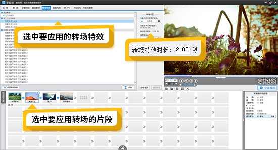 在【已添加片段】列表中,选择需要添加转场特效的视频片段,直接点击缩略图即可。然后在【转场特效】的特效列表里选择合适的转场特效,点击【应用/修改】即可应用。