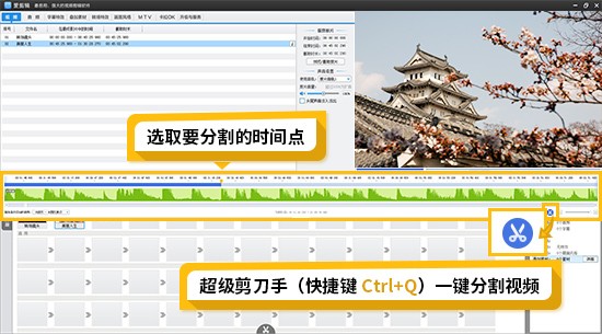 方法1:点击页面右上角的“预览框”时间进度条上向下凸起的“向下箭头”,快捷键为【Ctrl+E】,这样就打开了【创新式时间轴】面板,将鼠标移动到要分割画面的附近,然后用【上下方向键】精准逐帧踩点来选取需要分割的画面,然后点击页面底部的“剪刀”图标,即【超级剪刀手】快捷键为【Ctrl+Q】,这样视频就被分割成了两段。以此类推可以把分频分割成好多段,然后就可以在【已添加片段】列表中选择需要删除的片段缩略图,点击缩略图右上角的“×”进行删除即可。再结合【音频波形图】,还可以实现更精准的踩点。