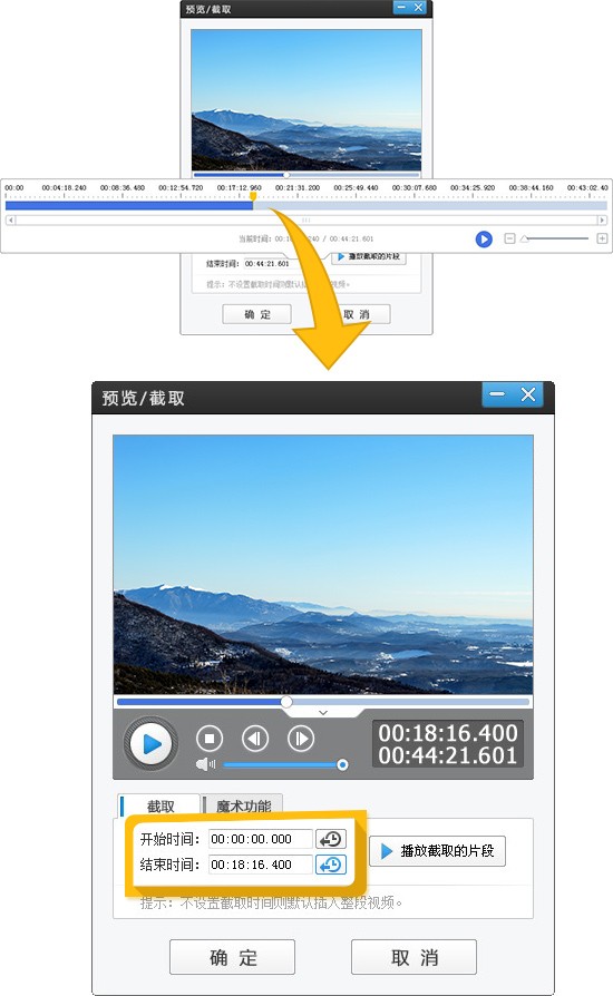 方法2:添加视频的时候或者直接双击底部的【已添加片段】面板中片段的缩略图,进入【预览/截取】对话框,通过【Ctrl+E】组合键把时间轴调出,然后就可以结合【方法1】中的方法选取所需画面,并点击对话框中的【截取的开始时间】和【截取的结束时间】处,带有左箭头的【拾取小按钮】,这样就可以快速拾取当前画面的开始和结束时间,从而实现视频片段截取。这种方法也可用在截取片段时间点的重新修改。
